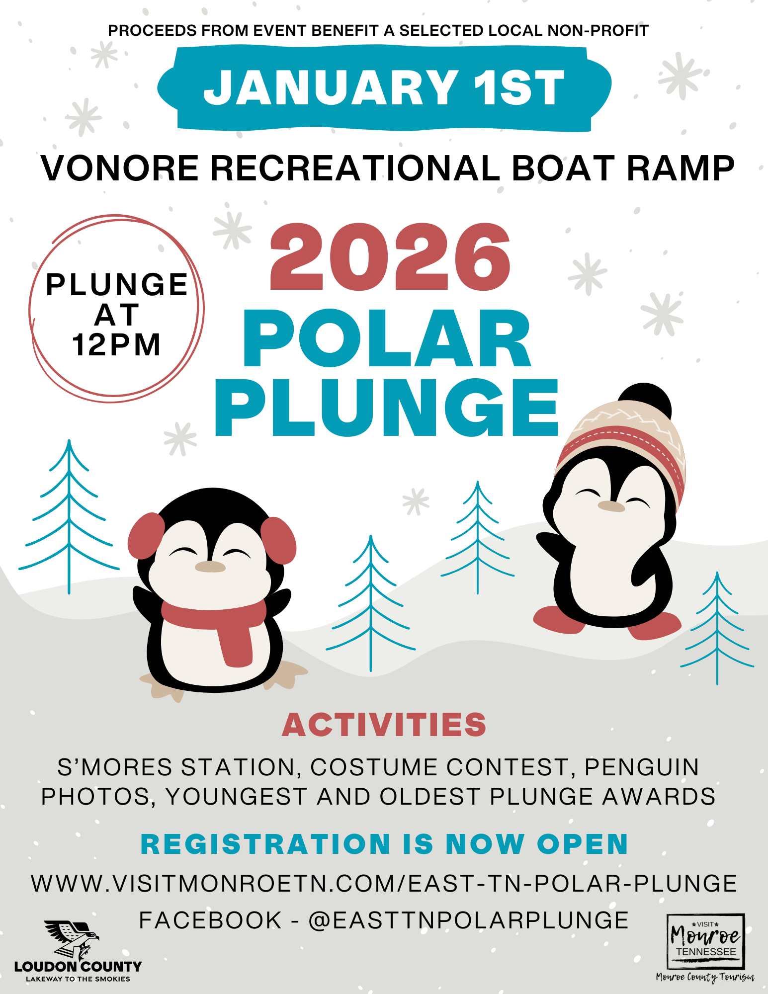 Kick the new year off with a fund event! Join us for our 2026 Annual Polar Plunge Event, presented jointly by Visit Loudon County and Visit Monroe County Tourism, plunge at noon on Thursday, January 1st, to be held at the Vonore Recreational Boat Ramp. Enjoy a S'mores Station, Costume Contest, Penguin Photos, and Youngest and Oldest Plunge Awards. Proceeds from this event will benefit a selected local Non-Profit organization. Registration is now open for this event - register in advance and receive $5 off the registration price! Early Registration ends December 31, 2025 - $30 adults, $20 kids 17 and under. Day of Registration from 11:00 to 11:30 am at Vonore Recreational Boat Ramp - $35 adults, $25 kids 17 and under.