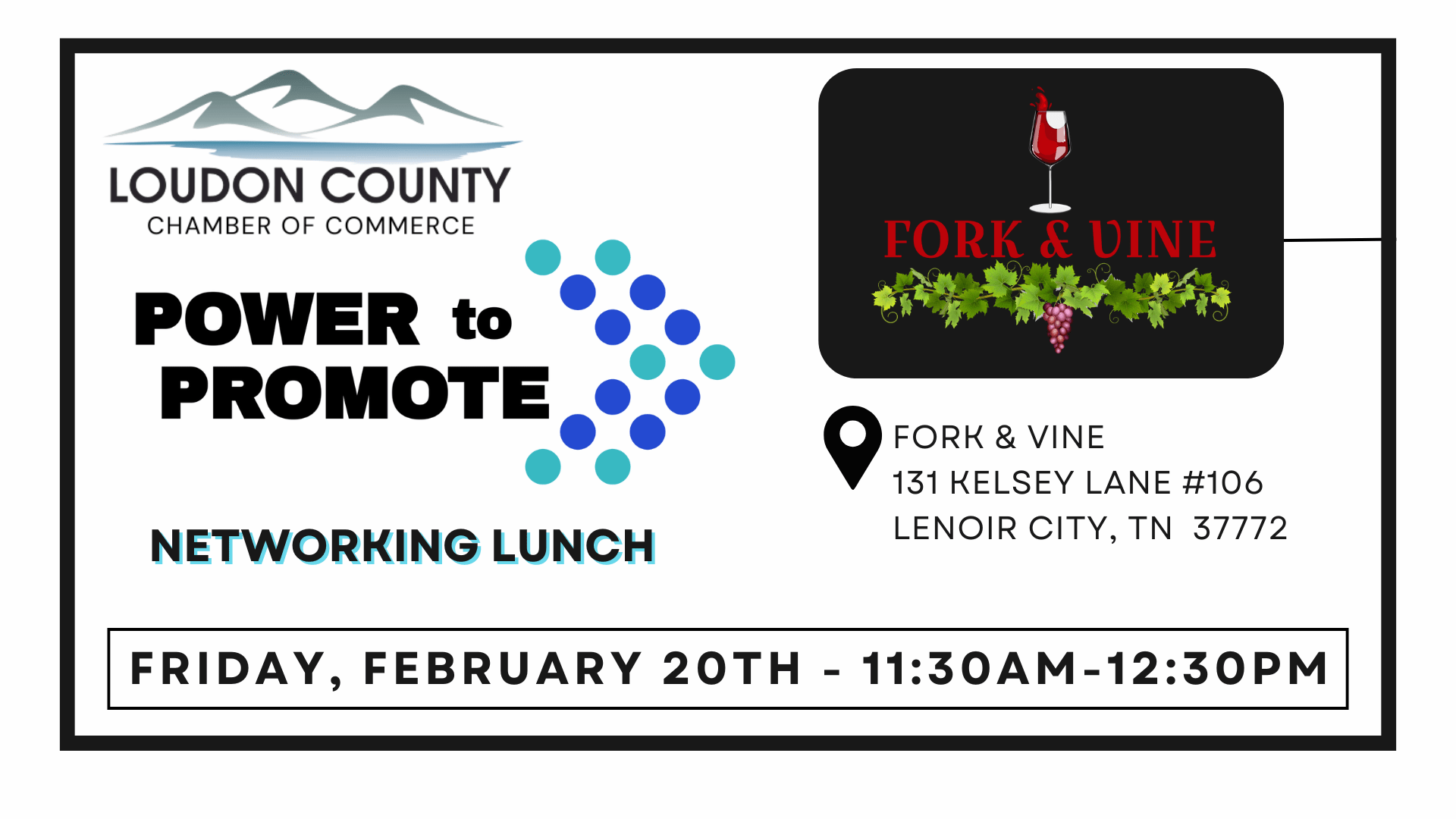 Join us on Friday, February 20th, 11:30-12:30pm, for our Chamber Power to Promote networking Lunch, hosted by The Fork and Vine in Lenoir City. This is a great way to network with other Chamber members and support a local Chamber member restaurant! Please register so that we will know how many plan to attend.