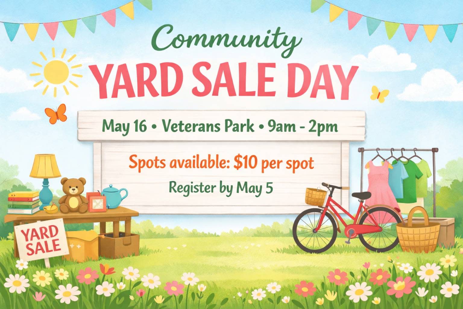 Register by May 5! Family fun, friendly faces, and great finds! $10.00 per spot. Limited spaces.
