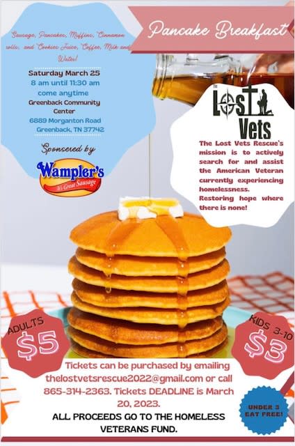 Come out and support a great cause, and have a delicious breakfast of sausage, pancakes, muffins, cinnamon rolls and cookies, juice, coffee, milk and water! Saturday, March 25th - 8:00 - 11:30 am, Greenback Community Center. Tickets are $5 for adults and $3 for children 3-10 (under 3 eat free). Tickets may be purchased by emailing thelostvetsrescue2022@gmail.com or call 865-314-2363. Deadline for ordering tickets is Monday, March 20th. Sponsored by Wampler's. All proceeds go to the Homeless Veterans Fund.Images