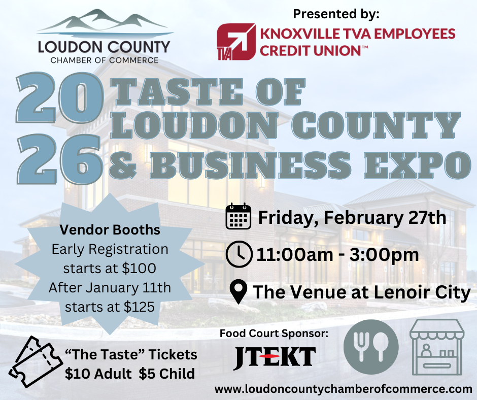 Mark your calendar and plan to join us for our Annual Taste of Loudon County and Business Expo 2026, to be held on Friday, February 27, 2026, 11 am - 3 pm, at The Venue at Lenoir City, 7690 Creekwood Park Blvd., Lenoir City. Our local restaurants will be serving great food and our Chamber member businesses will be on hand to discuss their services and how they can help you.