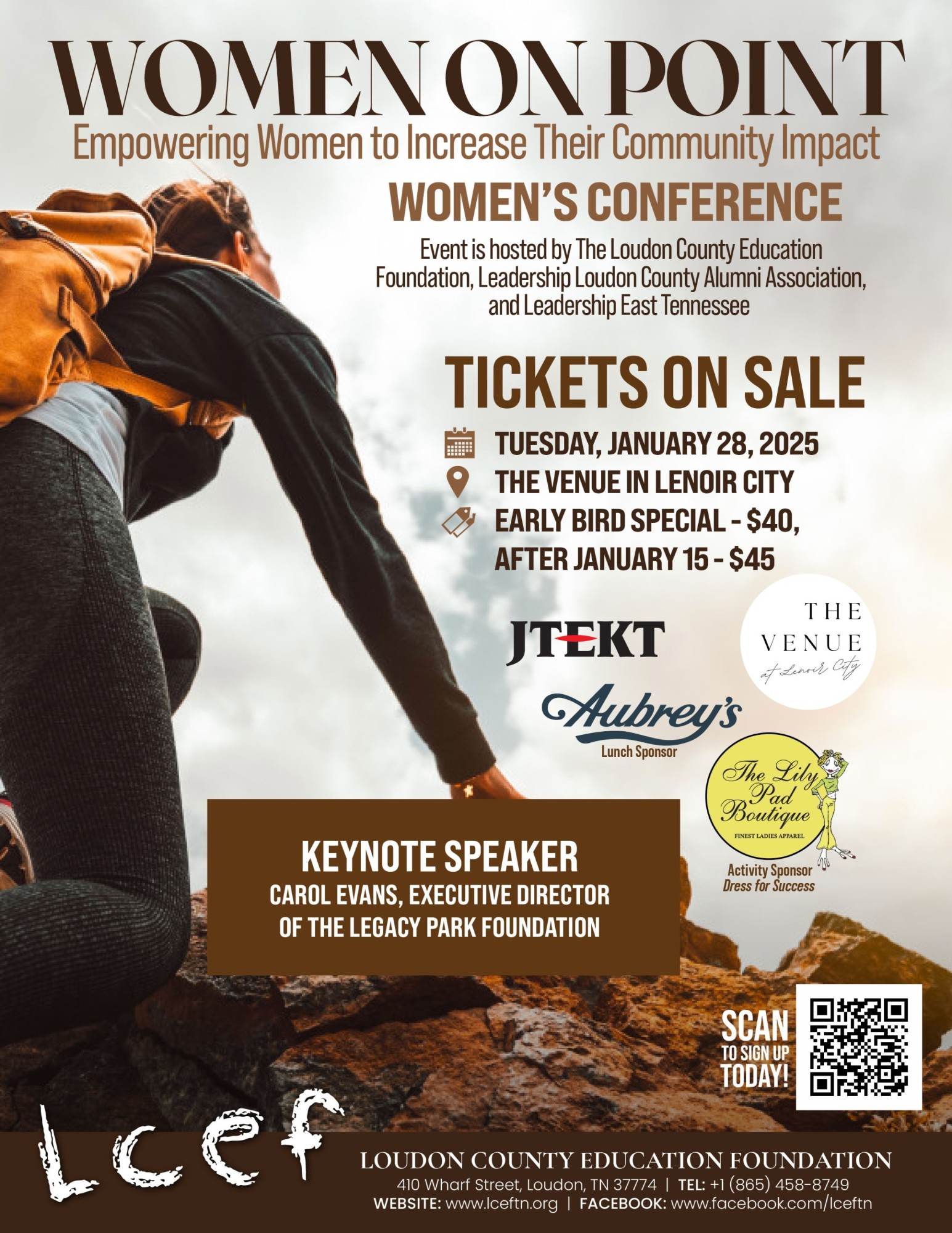 Women on Point Women's Conference - Check in at 8:30 am, 9 am Start, to be held at The Venue at Lenoir City, 7690 Creekwood Park Blvd., Lenoir City. Keynote Speaker - Carol Evans, Executive Director of the Legacy Park Foundation. Cost is $40 per person before January 15, 2025, $45 after January 15, 2025. Register using the QR code above, or visit https://lcef.give-2.com/event_donation_show/5/1.