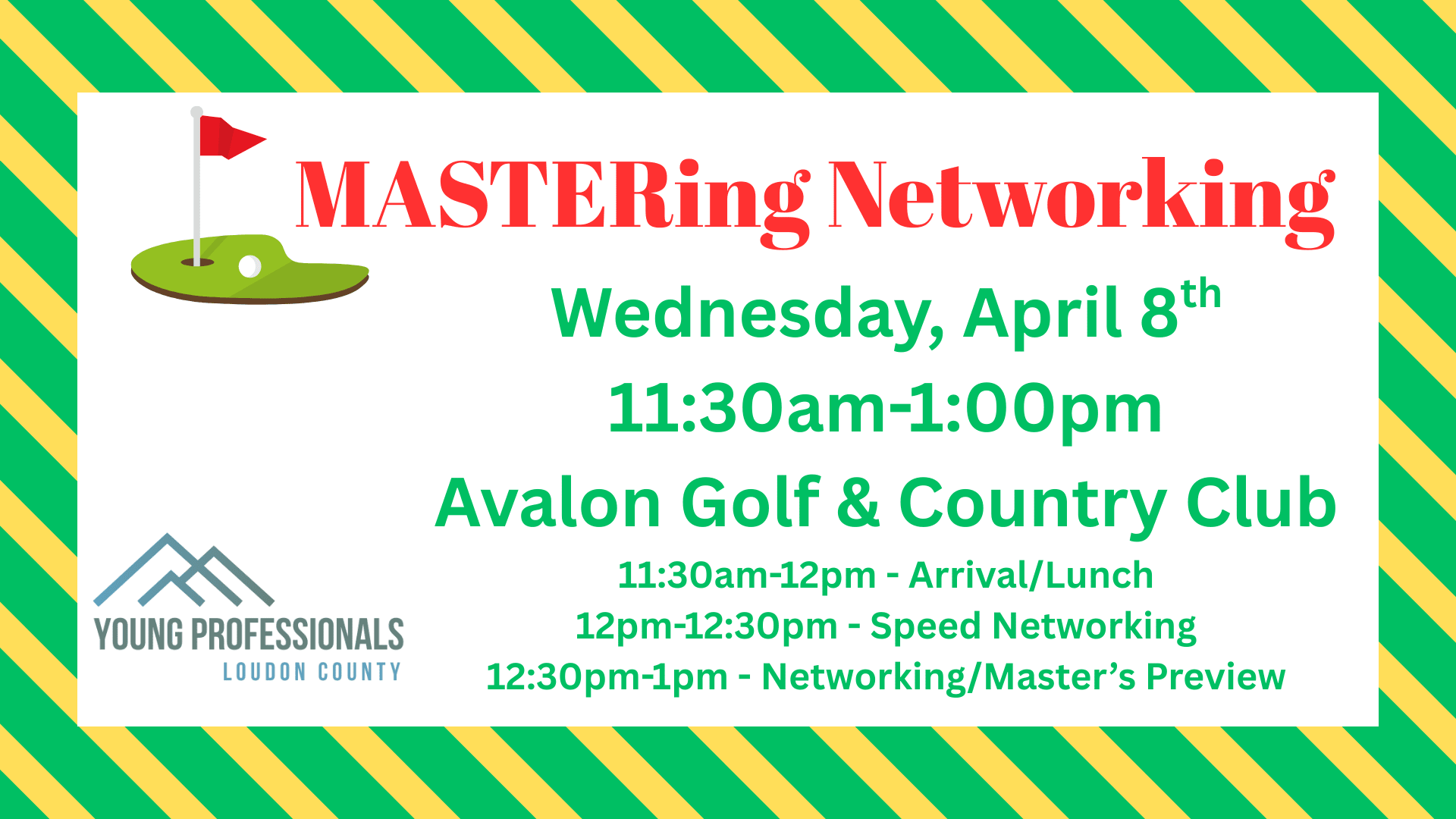 Join the Young Professionals of Loudon County for a Master's themed networking event!! This will be an opportunity to participate in speed networking while also receiving ice-breaking/conversation tools to use in everyday networking scenarios. We will take 30 minutes to complete the speed networking rounds with the last 30 minutes used for follow-up networking and catching up on the Master's golf tournament (optional). Please register if you plan to attend this fun approach to networking!! Lunch will be included.