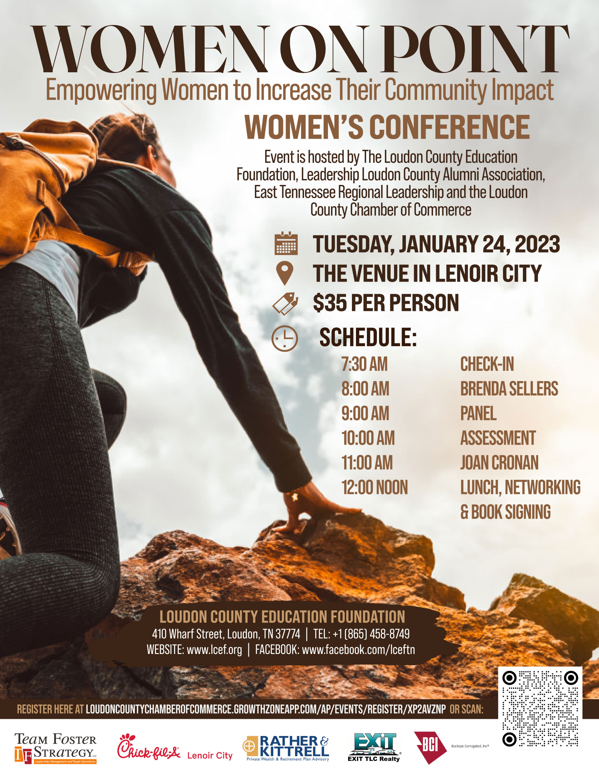 Join our event hosts - Loudon County Education Foundation, Leadership Loudon County Alumni Association, East Tennessee Regional Leadership, and the Loudon County Chamber of Commerce - for our Women's Conference: Women on Point - Empowering Women to Increase Their Community Impact. The Conference will take place on Tuesday, January 24, 2023, 7:30 am - 1:30 pm, at The Venue at Lenoir City, 7690 Creekwood Park Blvd., Lenoir City. Cost is only $35 per person. See flyer for schedule of events.