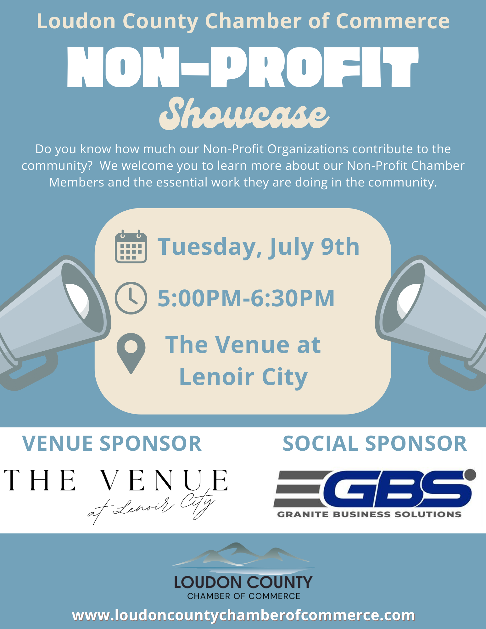 DESCRIPTION:Join us for our July Business after Hours\, Tuesday\, July 9th\, 5:00-6:30 p.m.\, featuring our Non-Profit Chamber Members\, The Venue at Lenoir City\, 7690 Creekwood Park Blvd.\, Lenoir City. Do you know how much our Non-Profit organizations contribute to our community? We welcome you to learn more about these essential organizations and meet them in person. Come out and enjoy great networking with other Chamber members\, great appetizers from The Venue Crew\, and beverages from our Social Sponsor\, Granite Business Solutions - specializing in nonprofit donation acceptance and event management. This event is free\, but please register so that we will know how many plan to attend.