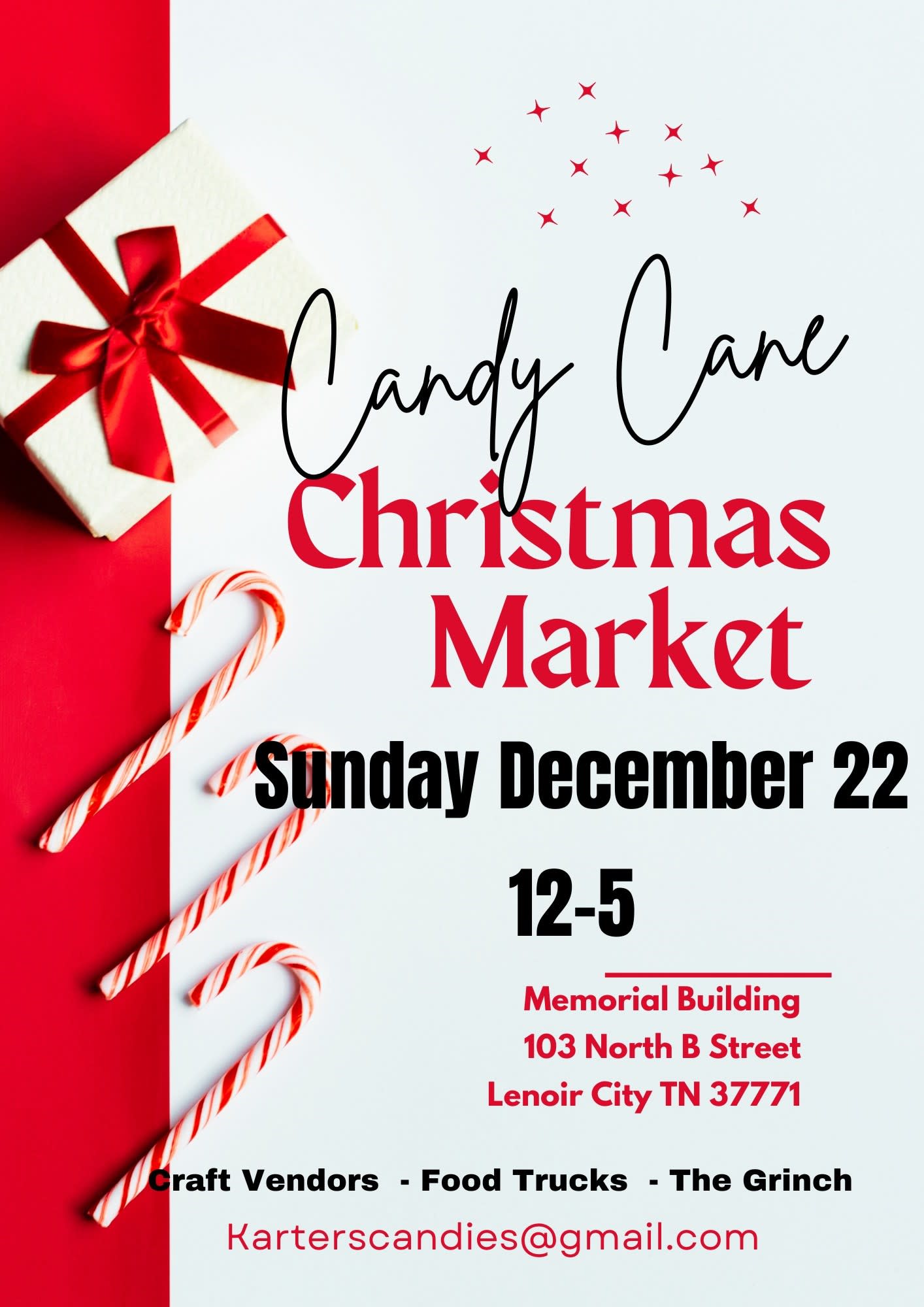 Join us on Sunday, December 22nd from Noon to 5 pm for the Candy Cane Christmas Market, Lenoir City War Memorial Building, 103 North B Street, Lenoir City. Come check out our craft vendors, food trucks, and a special appearance by The Grinch! Contact Missy Kline at 865-385-0965 or Karterscandies@gmail.com for more information. Visit the Facebook page at https://facebook.com/events/s/candy-cane-christmas-market/937292614437661/. Fun for the entire family!