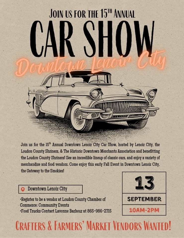 Join the City of Lenoir City, the Historic Downtown Lenoir City Merchants Association & the Loudon County Shrine Club on Saturday, September 13th, 10 am - 2 pm, for a Car Show in Downtown Lenoir City! Over 200 show cars will be on display and dozens of vendors! Show off your ride and support the Shriners! .