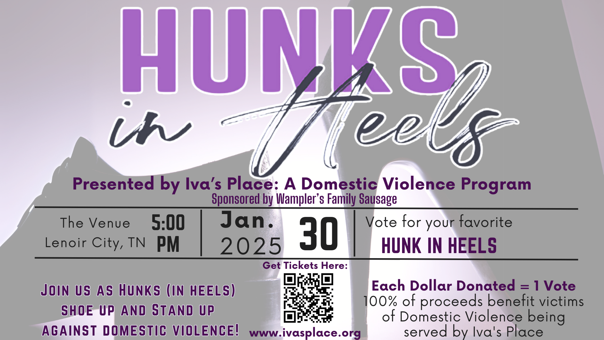 Iva’s Place will host our annual Hunks In Heels fundraiser on Thursday, January 30th at The Venue in Lenoir City, Tennessee. The event proved to be an insightful and lighthearted occasion to bring awareness to the community. Its an opportunity to “step up, shoe up, and speak up” on behalf of abuse victims and their children, as well as start conversations related to the causes and effects of domestic violence and the remedies offered through our programs. Voting is $1 per vote, $5 minimum! Simply click on the hunk you'd like to vote for, check out their Hunk page and donate to vote! Tables are $600 for 8 seats Individual Tickets are $75 Ticket sales can be credited to a Hunk of your choice. Tickets include a delicious meal and two drink tickets. The event will also include a bourbon pull, a silent auction, entertainment, and more!