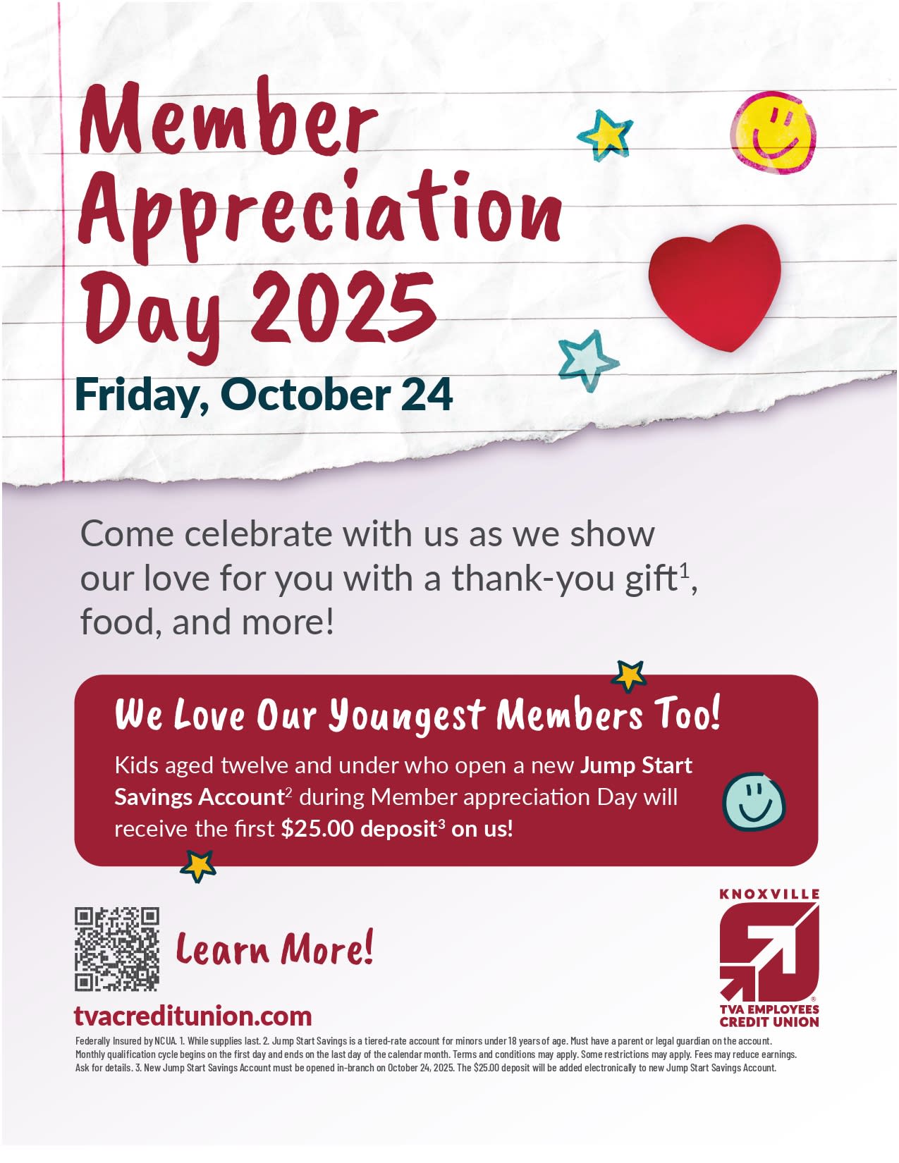 Knoxville TVA Employees Credit Union loves our members! Come celebrate with us on October 24th as we show our love for you with a thank-you gift, food, and more! Kids aged twelve and under who open a new Jump Start Savings Account during Member Appreciation Day will receive the first $25.00 deposit on us!